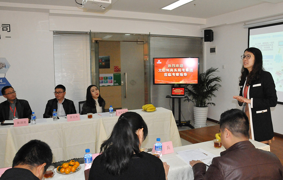 文山州商務(wù)局局長陶艷,市場體系建設(shè)科、硯山縣、西疇縣、麻栗坡縣、馬關(guān)縣、丘北縣、廣南縣工信商務(wù)局等主要領(lǐng)導(dǎo)共13人蒞臨天度集團(tuán)考察調(diào)研,天度集團(tuán)董事長鄭桂文、昆明電子商務(wù)協(xié)會秘書長胡曉玲、天度網(wǎng)絡(luò)公司楊副總經(jīng)理、蔚嵐信息技術(shù)有限公司總經(jīng)理陳玉鳳、天度軟件公司總經(jīng)理張羽昊、天度品牌中心負(fù)責(zé)人等參加了本次調(diào)研會議。雙方就農(nóng)產(chǎn)品供應(yīng)鏈打造、電商培訓(xùn)及宣傳、區(qū)域公共品牌培育、電商大數(shù)據(jù)中心等進(jìn)行了調(diào)研和交流。